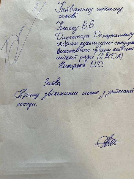 Он прикрепил фото заявления, которое написал чиновник. Также Кличко обнародовал распоряжение об увольнении Никоряка.